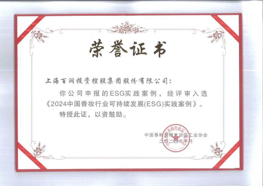 公司申报的ESG实践案例,经中国香料香精化妆品工业协会评审,成功入选《2024中国香妆行业可持续发展(ESG)实践案例》。该案例集于2024年10月19日在中国香精香料化妆品工业协会年会上正式发布,旨在总结香妆行业ESG成果并推广优秀实践案例。